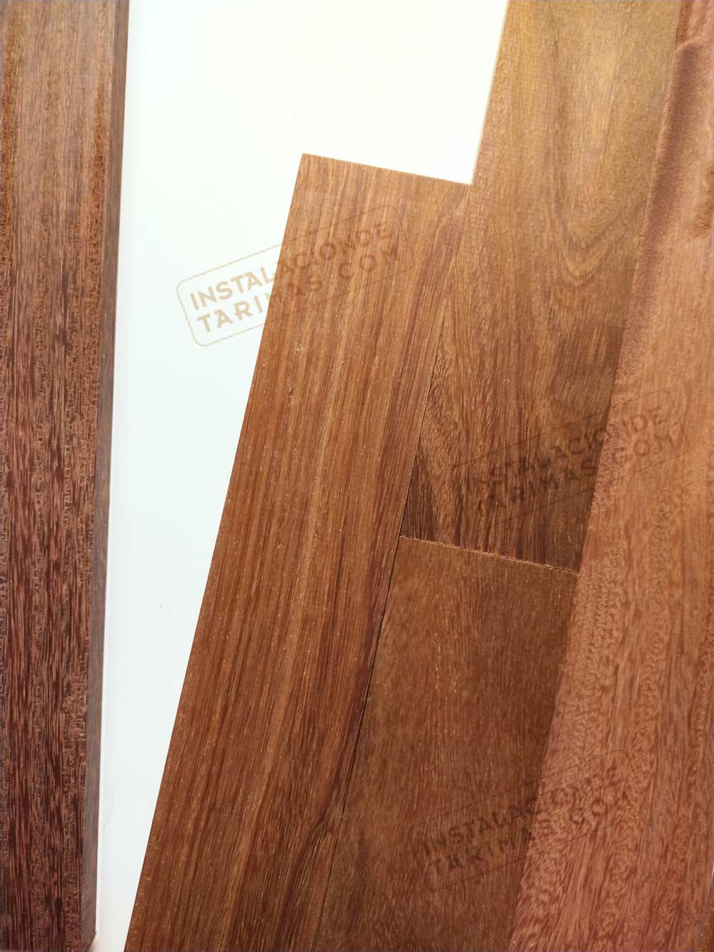 Vas a disponer de 1,4 cm de madera útil, piensa que un laminado, que lleva una capa de madera noble, solamente dispone de 4 milímetros de madera. El resto es un contrachapado o una capa de madera económica (pino, abeto, etc.) poco durable y atacable por las termitas y demás insectos. Todo cuestión es apariencia o durabilidad. El elondo es una madera comparable con el ipé del Brasil.
