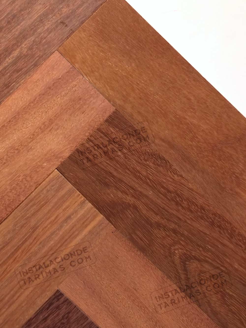 Lamparqué de madera de elondo en espiga. Fotos reales del producto.