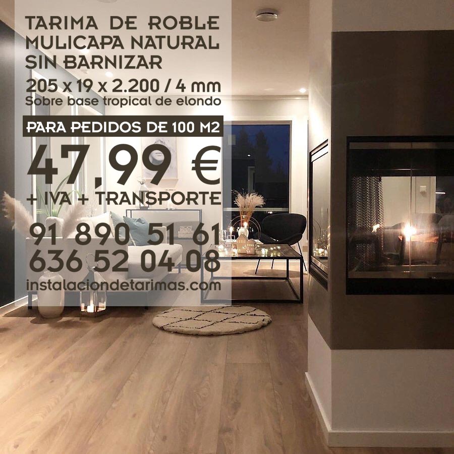 Oferta disponible para pedidos de más de 35 m2 de tarima multicapa de roble sin barnizar. Medidas 205 mm de ancho x 19 mm de grosor x 2.200-2.400 mm de longitud / 4 mm útiles. No se incluye la instalación, instalamos en Madrid y Barcelona. Otras localidades consultar.